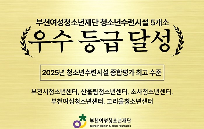 [파이낸셜경제=김기보 기자] 부천여성청소년재단이 청소년수련시설 5개소(부천시청소년센터, 산울림청소년센터, 소사청소년센터, 부천여성청소년센터, 고리울청소년센터)가 성평등가족부 주관 2025년 청소년수련시설 종합평가에서 5개 시설 모두 최고 수준인 ‘우수’ 등급을 달성하는 쾌거를 이루었다.