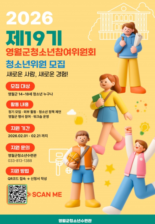[파이낸셜경제=조성환 기자] 영월군청소년수련관은 관내 중~고등학교 청소년을 대상으로 오는 21일(토)까지 영월군청소년참여기구 신규, 연임 위원을 추가 모집한다.