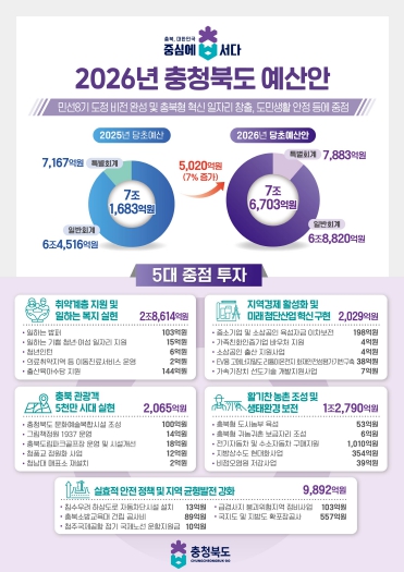 [파이낸셜경제=김기보 기자] 충청북도는 민선8기 도정 비전 완성 및 충북형 혁신 일자리 창출, 도민 생활 안정 등을 위해 2026년도 예산안을 편성하여 11월 11일 충청북도의회에 제출했다.