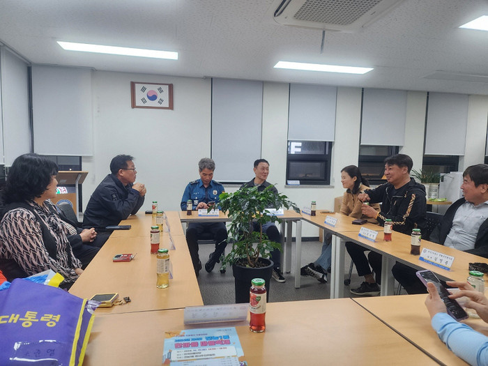 | ▲ 전농1동 파출소 김동인 소장과 안창호 생활안전 협의회 회장 회의 모습 – 이미지제공 분양7번가 |