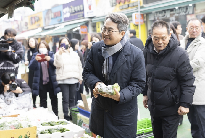15일 27번째 민생경제 현장투어(달달버스-달려간 곳마다 달라집니다)차 의왕시를 찾은 김동연 지사는 도깨비시장 피해복구 공사 진행 상황과 설을 앞둔 시장 물가 동향 등을 점검하며 시장 상인들과 대화를 나눴다.