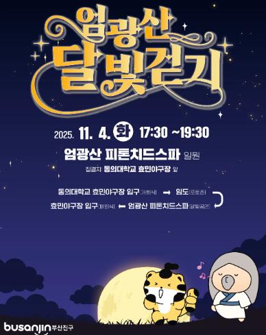 [파이낸셜경제=박영진 기자] 부산 부산진구는 오는 11월 4일 오후 5시 30분에 동의대학교 효민야구장 앞에서 자연환경과 음악·퍼포먼스가 어우러진 엄광산 달빛걷기 행사를 개최한다고 밝혔다.