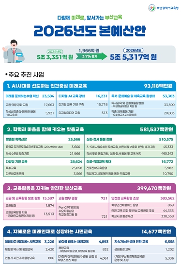 이번 세출 예산안은 ‘다함께 미래로, 앞서가는 부산교육’을 비전으로 ▲AI시대를 선도하는 인간중심 미래교육 ▲학력과 마음을 함께 키우는 맞춤교육 ▲교육활동을 지키는 안전한 부산교육▲지혜로운 미래인재로 성장하는 시민교육 등 4대 역점 과제를 중심으로 주요 교육정책을 차질 없이 추진할 수 있도록 편성했다.
