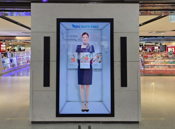 JDC면세점은 국내 면세점 업계 최초로 최신형 무안경 3D 디스플레이와 양방향 소통형 AI 가상 모델 제이디(J-Di)′를 결합한 차세대 스마트 안내 시스템을 전격 도입했다고 24일 밝혔다.