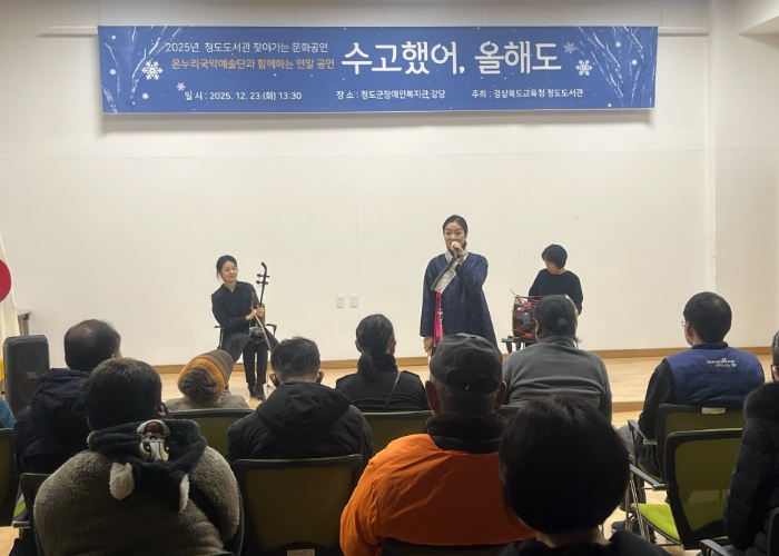 [파이낸셜경제=김지훈 기자] 경상북도교육청 청도도서관은 12월 23일 청도군장애인복지관에서 문화소외계층의 문화예술 접근성 향상을 위한 찾아가는 문화공연을 개최하고 성황리에 마무리했다.
