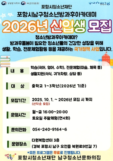 [파이낸셜경제=김지훈 기자] 포항시청소년재단 남구 청소년방과후아카데미는 오는 31일까지 2026년 신입생을 모집한다.