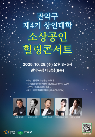 [파이낸셜경제=김예빈 기자] 관악구는 오는 10월 29일 오후 3시, 구청 8층 대강당에서 관내 소상공인을 위한 힐링콘서트를 개최한다.