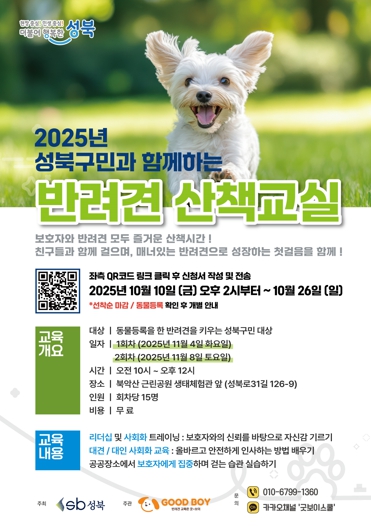 [파이낸셜경제=김예빈 기자] 서울시 성북구가 11월 4일과 8일 전문가와 함께하는 체험형 반려견 산책교육을 실시한다. 이번 교육은 성북구민과 반려견이 함께 참여해 산책 습관과 사회화 훈련을 배우는 프로그램이다.