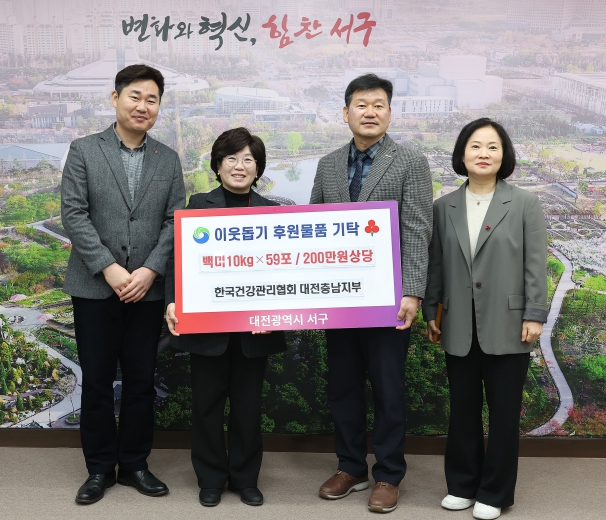 [파이낸셜경제=김영란 기자] 대전 서구는 15일 한국건강관리협회 대전·충남지부(대표 김인원)로부터 백미 10kg 59포(200만 원 상당)를 기탁받았다.