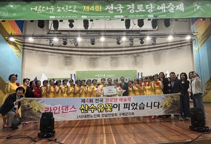 [파이낸셜경제=김예빈 기자] 전남 구례군 노인회(라인댄스팀)는 (사)대한노인회가 주관한 2025년 제4회 전국 경로당 예술제에서 전라남도 대표로 참가해 금상을 받았다고 밝혔다.