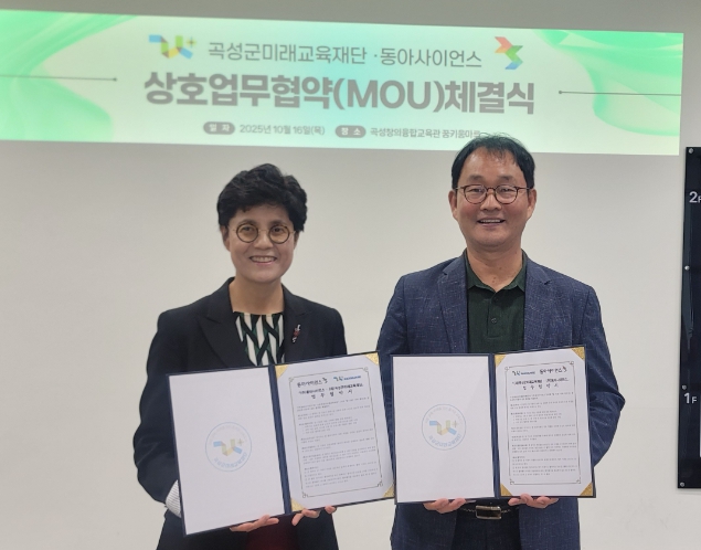 [파이낸셜경제=김예빈 기자] 곡성군미래교육재단은 지난 16일 국내 대표 과학기술 전문 콘텐츠 기업 ㈜동아사이언스(대표이사 장경애)와 과학문화 확산 및 AI 융합 인재 육성을 위한 업무협약(MOU)을 체결했다고 17일 밝혔다.