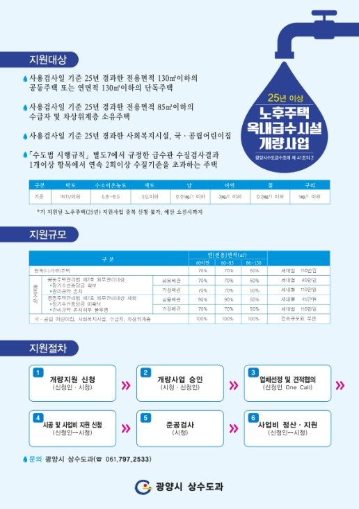 지원 대상은 사용검사일 기준 25년 이상 경과한 주택 가운데 전용면적 130㎡ 이하 공동주택과 연면적 130㎡ 이하 단독주택의 옥내급수시설이며, 개인 배관은 물론 공용 배관도 지원한다.