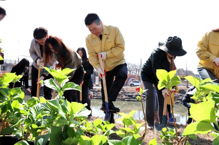 '모두가 누리는 가치있는 숲'이라는 주제로 열린 이날 행사에는 권익현 부안군수를 비롯한 공무원, 군의회, 부안군 산림조합, 일반군민 등 200여명이 참여했으며, 수국 2,000본을 정성껏 심으며 숲이 주는 가치와 자연의 소중함을 직접 체험하고 공유하는 시간을 가졌다.