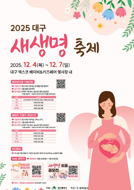 [파이낸셜경제=김지훈 기자] 대구광역시는 저출산·고령화 시대 속에서 생명의 소중함을 되새기고, 가족 친화적인 지역 문화를 확산하기 위해 12월 4일부터 7일까지 엑스코 동관에서 ‘2025년 대구 새생명 축제’를 개최한다.