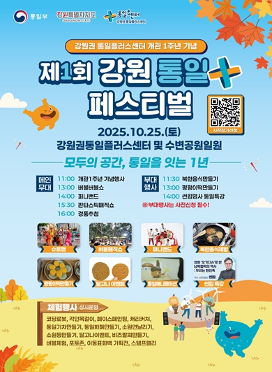 [파이낸셜경제=조성환 기자] 강원특별자치도는 오는 10월 25일 오전 10시 30분, 춘천 삼천동 강원권 통일플러스센터 및 수변공원 일원에서 센터 개관 1주년을 기념한 '통일플러스페스티벌'을 개최한다고 밝혔다.