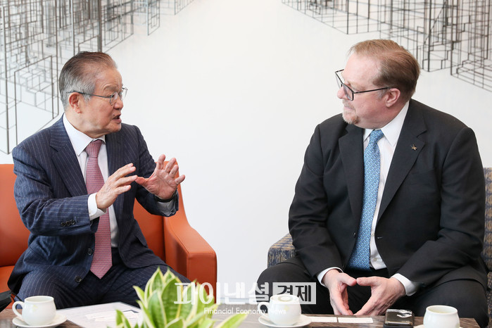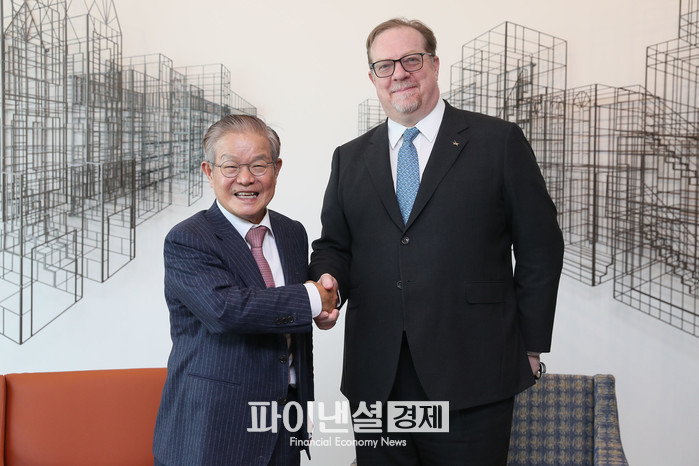 [파이낸셜경제=김영란 기자] 권태신 전경련 부회장(왼쪽)이 12일 전경련을 방문한 로버트 랭 주한캐나다상의 회장을 접견하고 한국-캐나다 수교 60주년을 맞아 양국 민간경제계 차원의 협력 강화 방안에 대해 논의했다.
