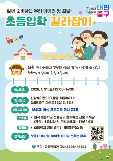 [파이낸셜경제=김예빈 기자] 서울 중구가 ‘2026 초등입학 길라잡이’ 설명회를 오는 31일 오후1시부터 신당누리센터 대강당에서 개최한다. 예비 초등학생과 학부모를 대상으로 약 1시간 반 동안 현직 교사가 첫 학교생활에 대한 궁금증을 해소해 줄 예정이다.
