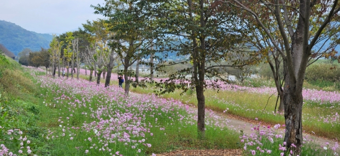 대황강변을 따라 흐드러지게 핀 코스모스는 맑은 공기와 이슬을 머금고 자라 여느 도로가의 코스모스보다 더욱 선명하고 생생한 빛깔을 자랑한다.
