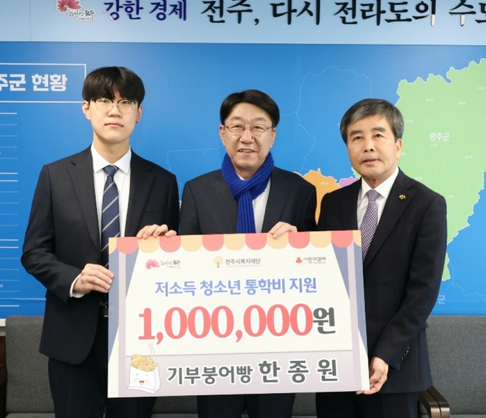 전주시복지재단은 3일 전주시 태평동에 거주하는 한종원 씨(22세)가 저소득가정 청소년 통학비 지원을 위한 성금 100만 원을 전달했다고 밝혔다.