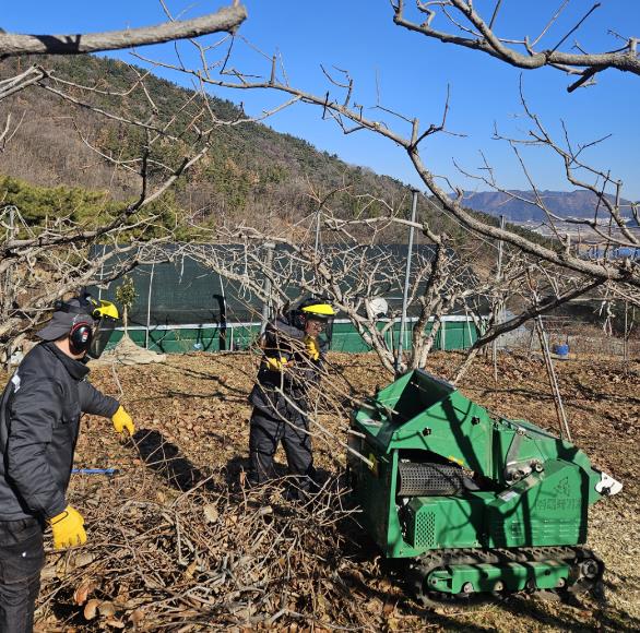 | ▲ 2026년 2월 10일_달성군 영농부산물 파쇄 사진(달성군 영농부산물 파쇄지원단이 지역 과수 농가를 찾아 과수 잔가지 등을 파쇄·정리하고 있다) |