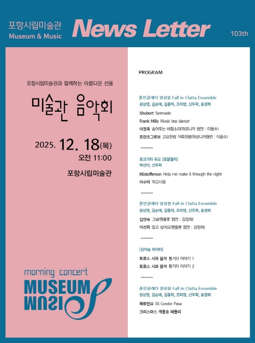 [파이낸셜경제=김지훈 기자] 포항시립미술관은 오는 18일 오전 11시, 제103회 미술관 음악회 ‘MUSEUM · MUSIC’를 개최한다.