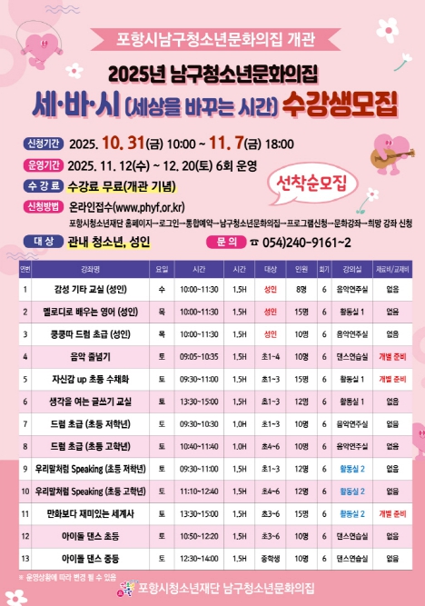 자세한 사항은 포항시청소년재단 남구 청소년문화의집 로 문의하면 된다.