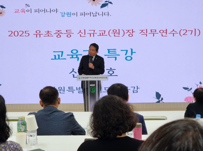 이번 연수에서는 ‘미래를 여는 학교 더 나은 강원교육을 위한 학교장의 역할’을 주제로 신경호 교육감의 특강이 진행됐다. 교육감은 새롭게 출발하는 학교장들에게 응원의 메시지를 전하며, 더 나은 강원교육 실현을 위한 지난 3년간의 변화와 앞으로의 비전을 공유하고, 교사 성장 지원과 혁신적 학교 문화 조성을 당부하며 강원교육의 미래를 함께 열어가자고 강조했다.