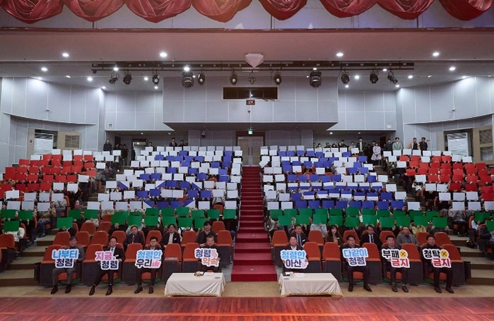 행사는 공직자 대표 2인의 청렴 실천 결의문을 낭독으로 시작됐다. 이어 전 직원이 참여해 부패방지, 청렴다짐 문구를 형상화한 카드 섹션 퍼포먼스로 이어지며 현장의 분위기를 고조시켰다.