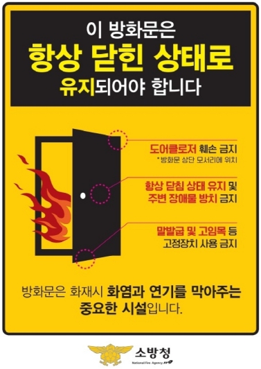 군민 여러분의 작은 관심과 실천이 나와 내 가족, 그리고 이웃의 생명을 지키는 큰 힘이 됩니다. 방화문을 항상 닫아 두는 습관, 이것이 바로 우리가 함께 만들 수 있는 가장 안전한 약속입니다.