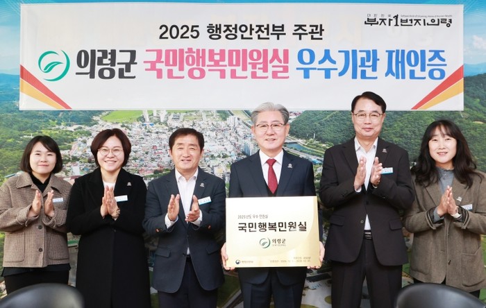 [파이낸셜경제=김예빈 기자] 의령군이 행정안전부가 주관하는 ‘국민행복민원실’ 재인증 평가에서 우수기관으로 선정됐다. 인증 기간은 2025년 12월 1일부터 2028년 12월 31일까지 3년간이다.