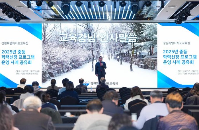 [파이낸셜경제=조성환 기자] 강원특별자치도교육청은 12월 5일 강릉 세인트존스호텔에서 도내 중·고등학교 교사 및 교감을 대상으로 ‘2025년 중등 학력신장 프로그램 운영 사례 나눔 연수’를 개최했다.