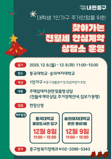 [파이낸셜경제=김예빈 기자] 서울 중구가 12월 8일과 9일에 동국대학교와 숭의여자대학교에서 대학생 1인 가구의 전월세 계약에 대한 불안과 부담을 덜어줄‘찾아가는 전월세 안심계약 상담소’를 운영한다. 지난 6월에 이은 두 번째 방문이다.
