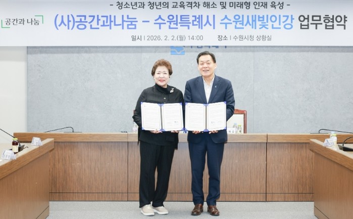 수원시와 (사)공간과나눔은 2일 시청 상황실에서 수원새빛인강 업무협약을 체결하고, 협력을 약속했다.