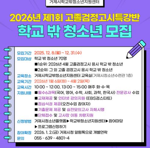 | ▲ 거제시학교밖청소년지원센터, '2026년 제1회 고졸검정고시 대비 특강반 참여 학교 밖 청소년 모집' |