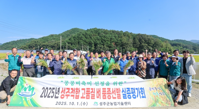 [파이낸셜경제=김지훈 기자] 성주군농업기술센터는 10월 1일 성주군 수륜면 소재 벼 품종비교포에서 성주군 쌀전업농회를 비롯한 농업인과 관계자 등 50여 명이 참석한 가운데 '2025년 고품질 벼 품종선발 실증시험포 평가회'를 개최했다.