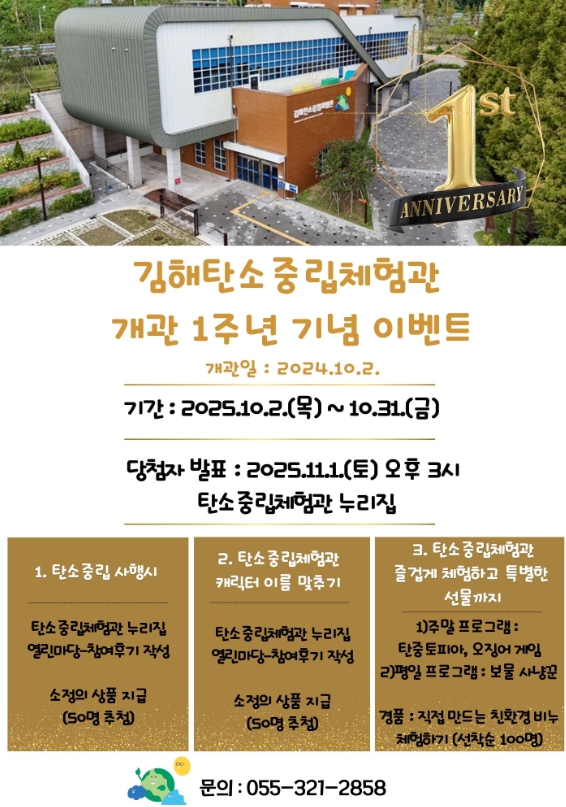 [파이낸셜경제=김예빈 기자] 김해시는 김해탄소중립체험관 개관 1주년을 맞아 2일부터 31일까지 한 달간 특별 기념 이벤트를 운영한다. 이번 이벤트는 온라인과 오프라인 어디든 자유롭게 참여할 수 있다.