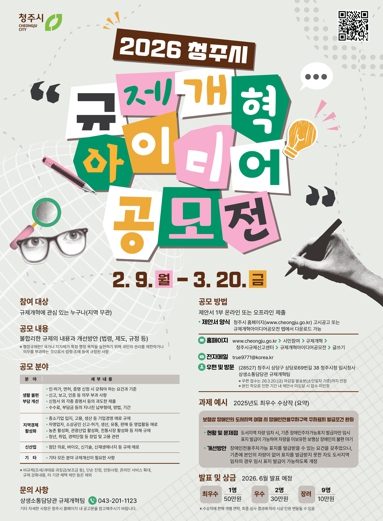 [파이낸셜경제=김기보 기자] 청주시는 시민이 체감할 수 있는 다양하고 창의적인 규제개혁 아이디어를 발굴해 일상생활과 경제활동을 제약하는 규제를 적극 개선하고자 ‘2026 청주시 규제개혁 아이디어 공모전’을 개최한다고 8일 밝혔다.