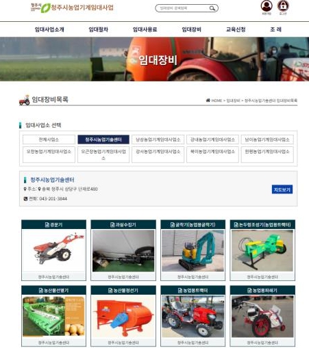 농기계 임대사업과 온라인 예약 관련 문의는 청주시농업기술센터 농업기계팀으로 하면 된다.