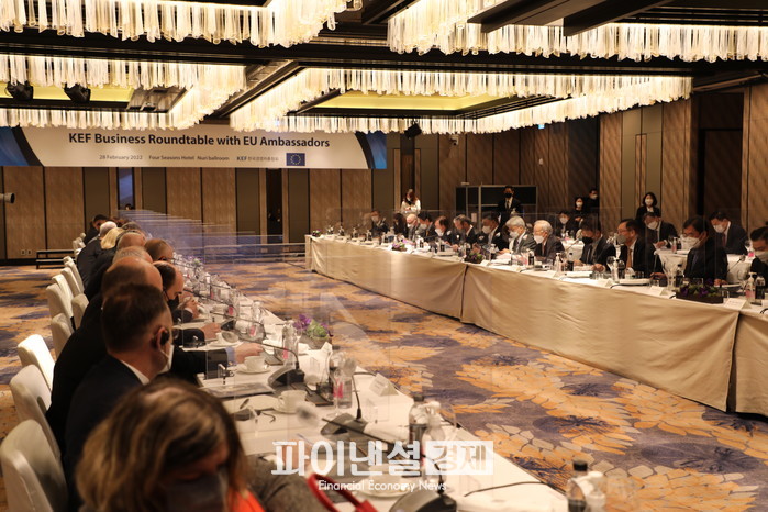 [파이낸셜경제=전병길 기자] 한국경영자총협회(회장 손경식, 이하 ‘경총’)는 2월28일(월) 포시즌스 호텔에서 주한 EU대사단 초청 회장단 간담회를 개최했다. EU 측에서는 마리아 카스티요 페르난데즈 주한 유럽연합(EU) 대사를 비롯한 EU 24개국 대사단이 참석했으며 경총에서는 회장단과 주요 기업이 참석했다.