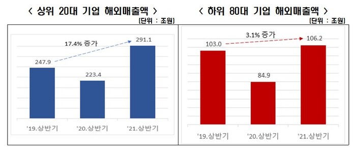 상위 20대 기업의 올해 상반기 해외매출액은 291.1조원으로 2019년 상반기 247.9조원 대비 17.4% 늘어났다. 하위 80대 기업은 106.2조원으로 2019년 상반기 103.0조원 대비 3.1% 증가했다.