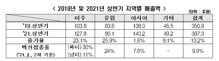 지역별로는 지난해 연말 이후, 백신접종이 본격화되었던 미주, 유럽에서의 매출액 증가세가 두드러졌다. 100대 기업의 올해 상반기 미주지역 매출액은 127.8조원으로 2019년 상반기 103.8조원 대비 23.1% 증가했다. 같은 기간 유럽지역 매출액은 63.6조원에서 80.1조원으로 25.9% 늘어났다. 반면, 상대적으로 백신접종이 더디게 이뤄지고 있는 아시아 지역은 2019년 상반기 대비 2021년 상반기 매출액이 각각 1.6% 증가하는데 그쳤다.