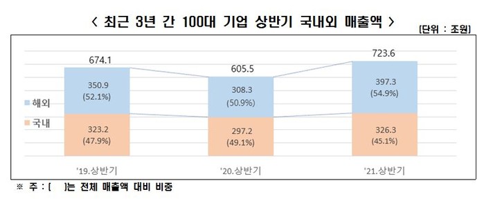 국내 100대 기업들의 올해 상반기 총 매출액은 723.6조원으로 코로나19 이전인 2019년 상반기 674.1조원 대비주2) 49.5조원 늘어났으며, 이 중 46.4조원(총 증가액 49.5조원의 93.7%)이 해외시장에서 발생했다. 반면, 국내매출 증가분은 3.1조원(6.3%)에 불과했다.