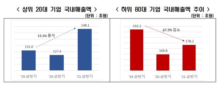 매출액 상위 20대 기업의 올해 상반기 국내매출액은 148.1조원으로 2019년 상반기 131.0조원 대비 13.1% 증가했다. 반면, 하위 80대 기업의 올해 상반기 국내 매출액은 178.2조원으로 2019년 상반기 192.2조원에 비해 △7.3% 감소했다.