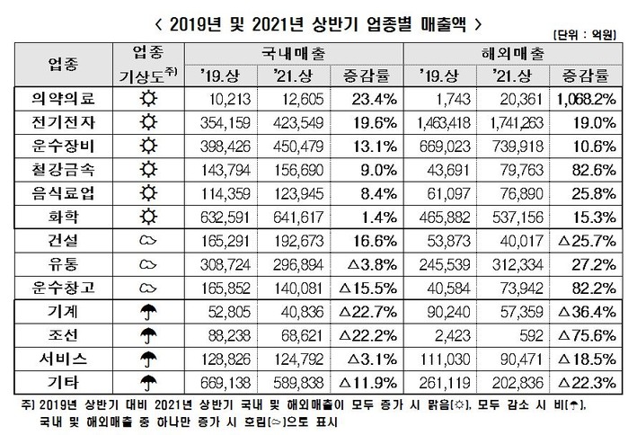 업종별로는 의약의료, 전기전자, 운수장비 등 6개 업종의 올해 상반기 국내 및 해외매출이 코로나19 이전인 2019년 상반기에 비해 늘어났다. 반면, 기계, 조선 등 3개 업종은 올해 상반기 국내외 매출이 모두 줄어들었다.