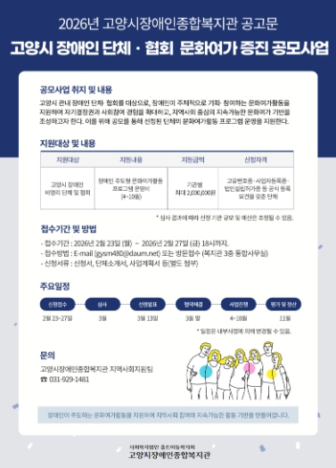 한편 본 공모사업의 신청 접수는 2월 23일부터 27일까지 진행되며, 자세한 내용은 고양시장애인종합복지관 누리집 또는 지역사회지원팀을 통해 확인할 수 있다.