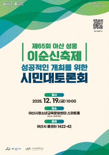 [파이낸셜경제=김영란 기자] (재)아산문화재단은 ‘'제65회 아산 성웅 이순신축제'의 성공적인 개최를 위한 시민 대토론회’를 오는 19일에 아산시청소년교육문화센터 스마트홀에서 연다.