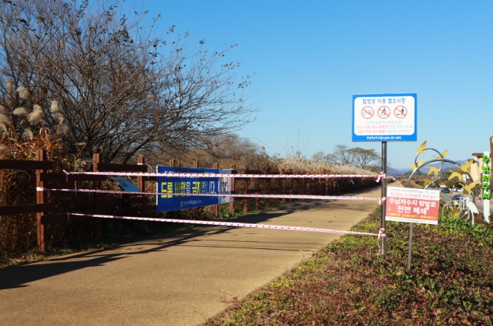 | ▲ 주남저수지 생태탐방로 진입로에 차단띠가 둘러져 있다. |