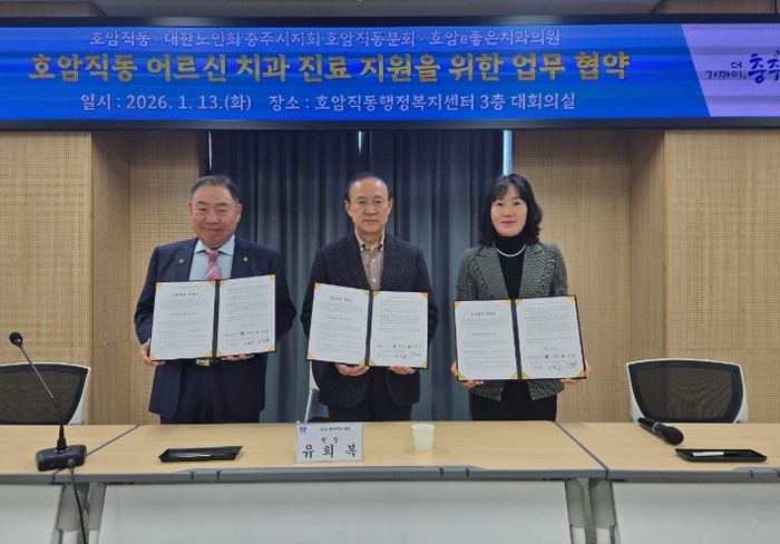 [파이낸셜경제=김기보 기자] 충주시 호암직동행정복지센터(동장 김민남)는 13일 대한노인회 충주시지회 호암직동분회(분회장 유덕상), 호암e좋은치과의원(원장 유희복)과 관내 어르신들의 건강 증진과 의료 접근성 향상을 위한 진료협력 협약을 체결했다.