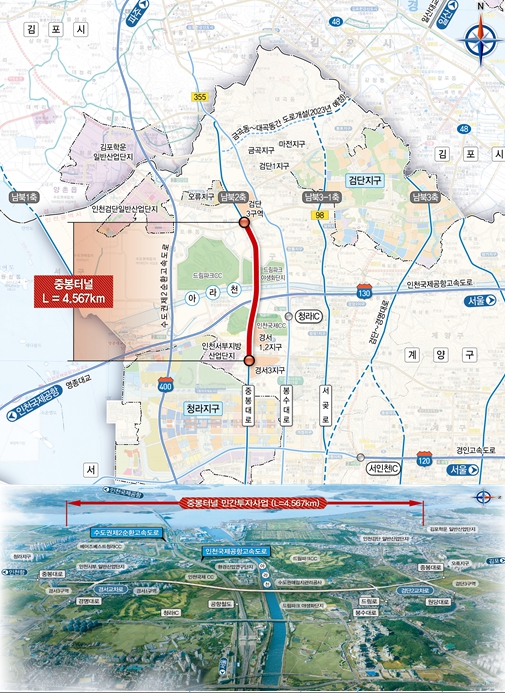 중봉터널 건설사업은 남북 2축 중 단절된 중봉대로(서구 경서동과 왕길동 구간)를 연결하는 총연장 4.57km, 왕복 4차로 규모의 민간투자사업으로 국비 512억 원이 투입되며 봉수대로와 서곶로 일대의 교통혼잡을 완화할 것으로 기대된다.