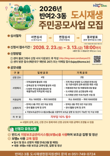 서면 심사와 면접을 거쳐 3월 중에 선정 결과를 발표할 예정이다. 이외 자세한 사항은 반여2·3동 도시재생현장지원센터 블로그에서 확인할 수 있다.